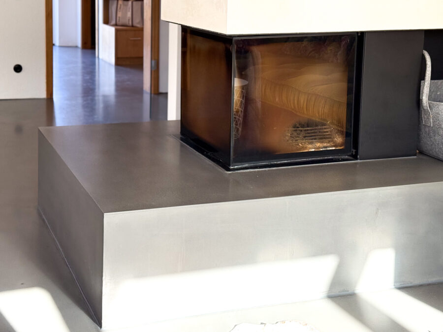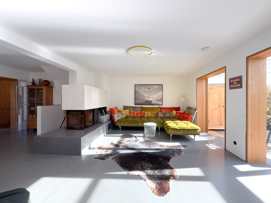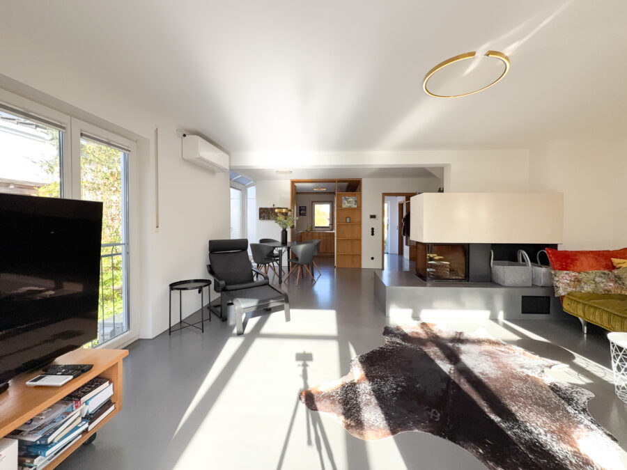 Das Wohnzimmer besticht durch sein offenes Raumgefühl und einen elegant integrierten Kamin, der moderne Gemütlichkeit ausstrahlt. Die fließende Verbindung zur offenen Designküche unterstreicht das harmonische Wohnkonzept: eine modern gestaltete Einbauküche aus edlem Holz, ausgestattet mit hochwertigsten Geräten (u.a. Bora-Muldenlüfter), vereint Funktionalität und Ästhetik auf höchstem Niveau.