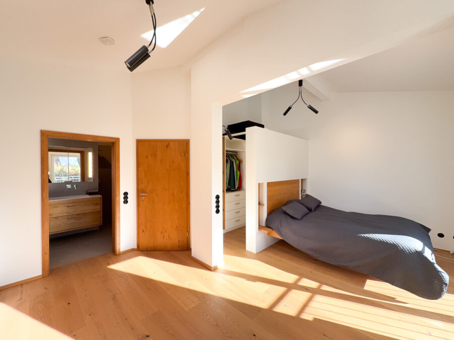 Im Obergeschoss setzt sich der moderne Stil fort. Das große Hauptschlafzimmer beeindruckt durch ruhige Farbgebung, natürliche Materialien und ein luxuriöses Badezimmer en suite, das mit exklusiven Armaturen und stilvollen Designelementen überzeugt. Das zweite Schlafzimmer verfügt ebenfalls über ein Duschbad en suite – ideal für Gäste oder Kinder.