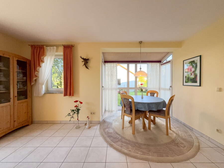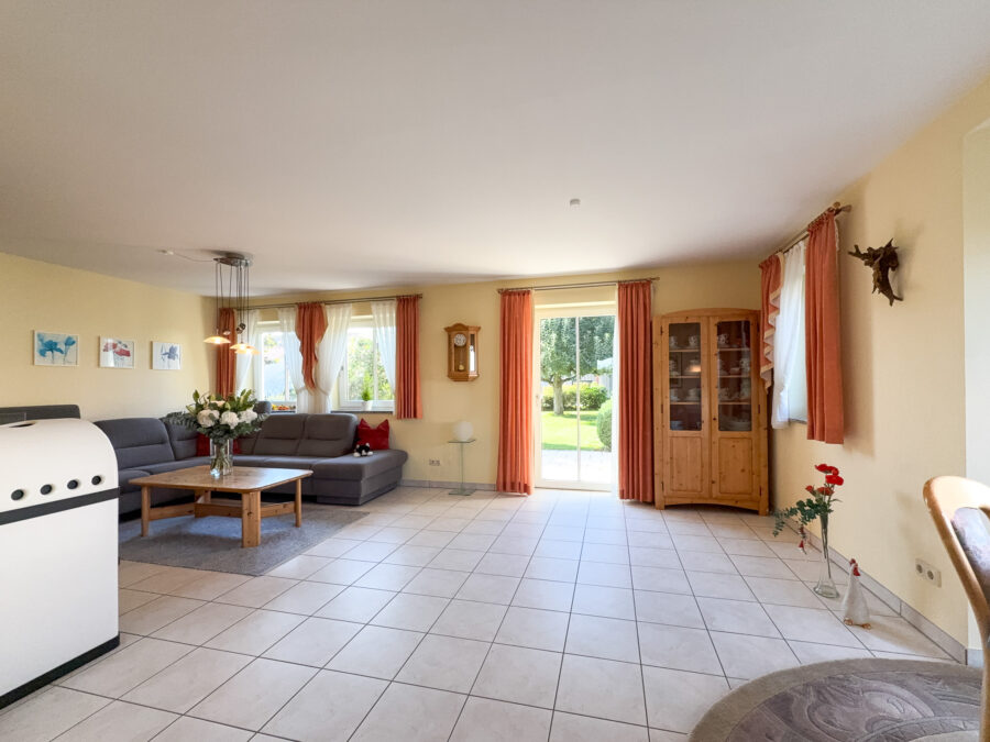 Im Erdgeschoss erwartet Sie ein lichtdurchflutetes Wohn- und Esszimmer mit direktem Zugang zur angrenzenden Küche – ideal für gesellige Abende mit Familie und Freunden. Die großen Fensterflächen sorgen für eine helle und freundliche Atmosphäre und bieten direkten Zugang zur Terrasse und dem Garten. Ein Schwedenofen sorgt für Behaglichkeit an kalten Tagen.