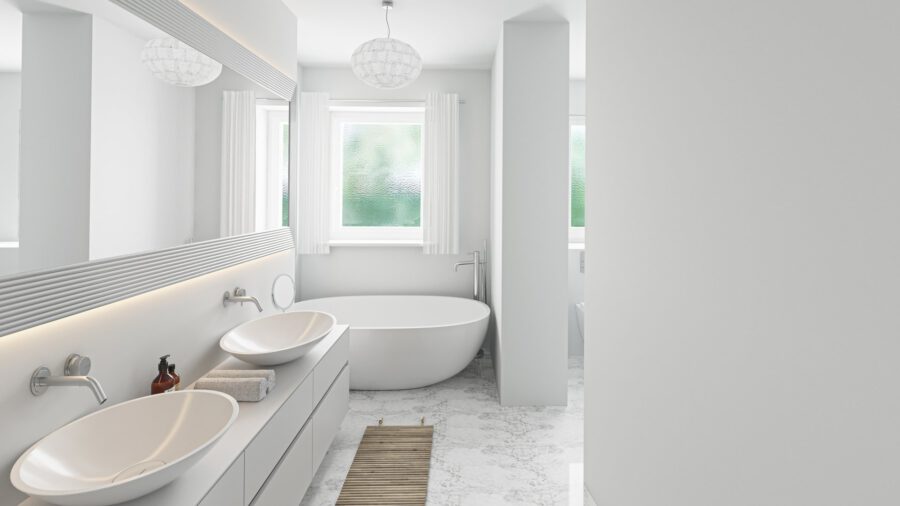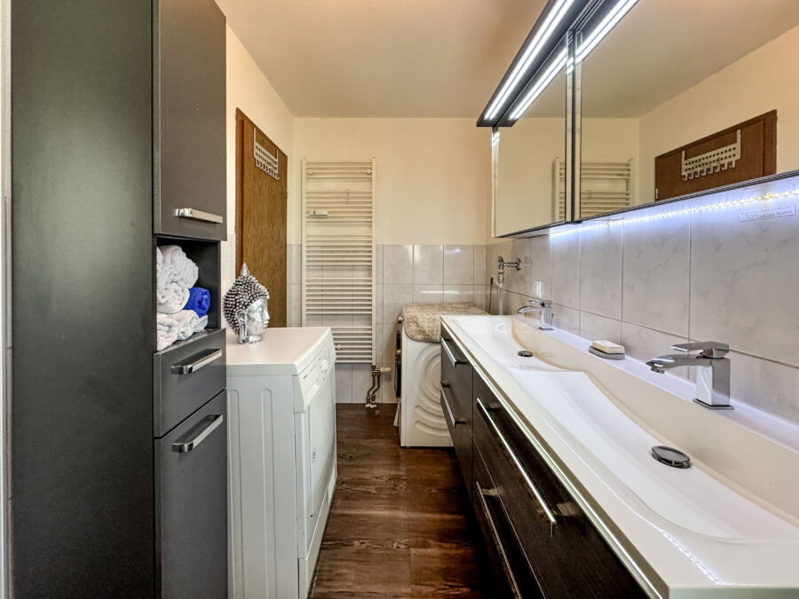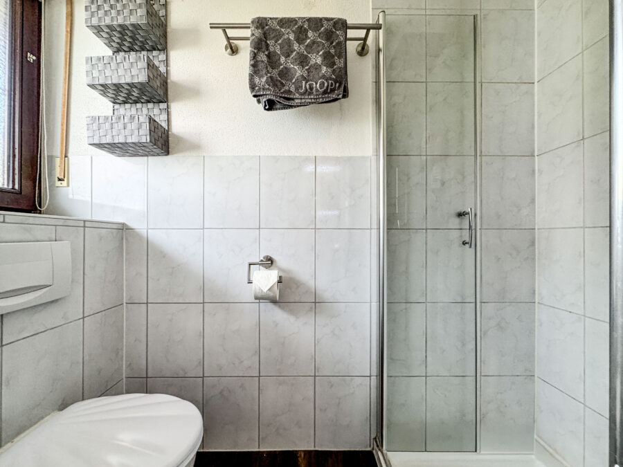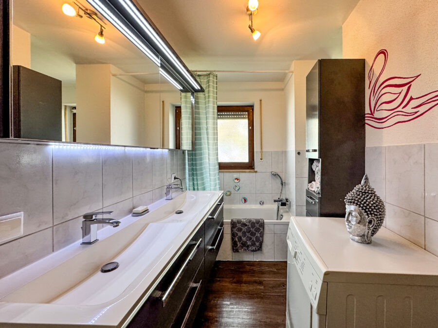 Das Tageslichtbad ist mit Badewanne, Dusche, Doppelwaschtisch und Toilette ausgestattet und präsentiert sich gepflegt und funktional. Besonders angenehm: Dusche und WC sind optisch abgetrennt, was für ein harmonisches Raumgefühl und zusätzliche Privatsphäre sorgt.