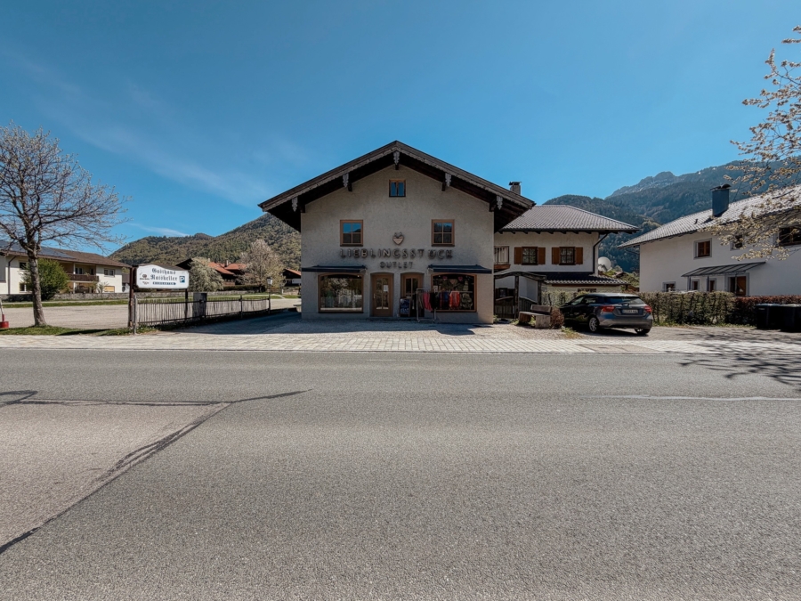 Das Gebäude überzeugt durch seine charakteristische alpenländische Bauweise und fügt sich harmonisch in das charmante Ortsbild der beliebten oberbayerischen Gemeinde ein. Traditionelle architektonische Elemente verleihen der Immobilie einen besonderen Charme und sorgen für eine repräsentative und einladende Außenwirkung.