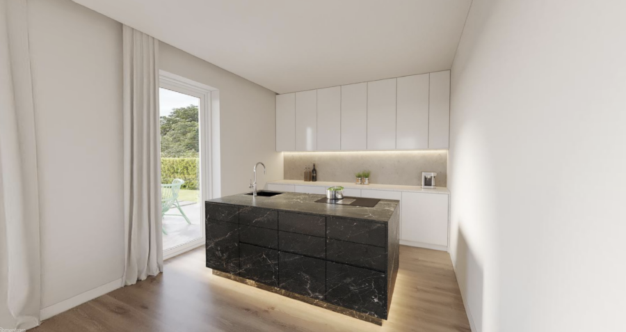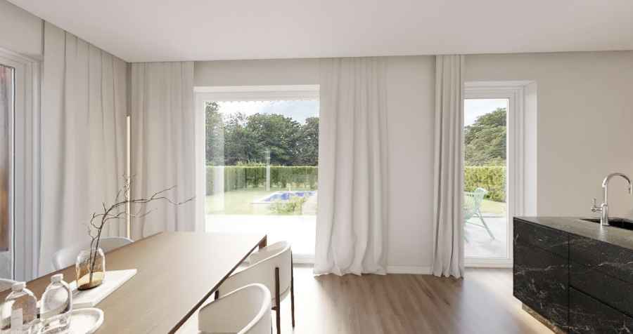 Die Häuser werden in massiver Bauweise errichtet, was für eine hohe Energieeffizienz (kfw 55), Langlebigkeit und ein angenehmes Raumklima sorgt. Die modernen Grundrisse sind durchdacht gestaltet, um maximalen Wohnkomfort zu bieten. Im Erdgeschoss erwartet Sie ein großzügiger, südlich und westlich ausgerichteter Wohn- und Essbereich, der viel Tageslicht durch große Fensterflächen erhält. Die offene Küche lädt zum gemeinsamen Kochen und Verweilen ein. Zusätzlich gibt es ein Gästezimmer, das sich ideal für Besucher oder als Home-Office eignet, sowie ein Gäste-WC, eine Garderobe und einen Technikraum, die den Alltag komfortabel machen.