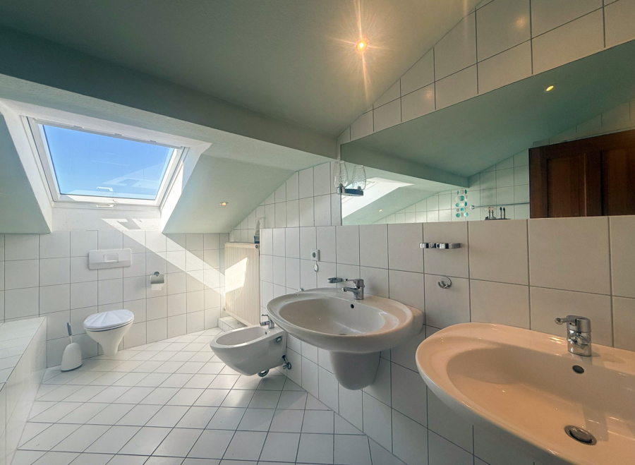 Das Badezimmer präsentiert sich funktional und komfortabel mit Badewanne, Dusche, WC und Bidet und kann in einen modernen Wellnessbereich umgestaltet werden. Ein großes Dachfenster sorgt für den Blick in die Sterne, Helligkeit und eine angenehme Belüftung. Zusätzlich steht ein separates Gäste-WC mit Anschlussmöglichkeit für Waschmaschine und Trockner zur Verfügung. Beide Sanitärräume verfügen über eine Fußbodenheizung.