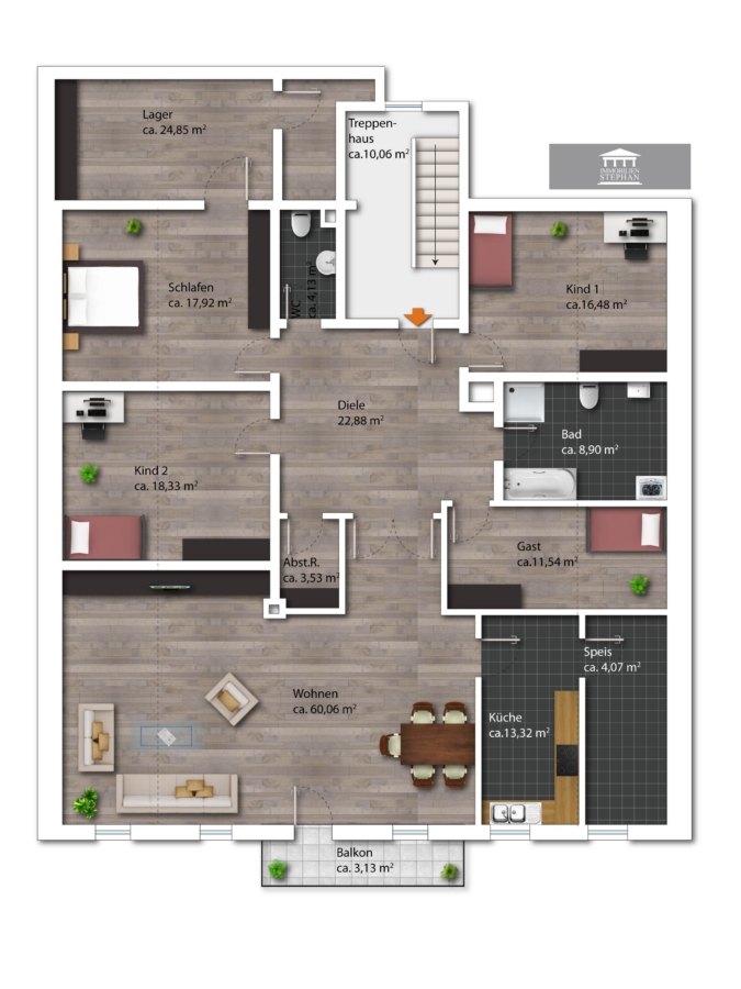 Schon beim Betreten der Wohnung setzt der Eingangsbereich ein erstes Ausrufezeichen: offen gestaltet und angenehm proportioniert, bietet er nicht nur viel Platz für Garderobe, Schränke und Stauraum, sondern vermittelt direkt beim Ankommen ein einladendes, wohliges Wohngefühl. Von hier aus erschließen sich die einzelnen Räume auf übersichtliche Weise.