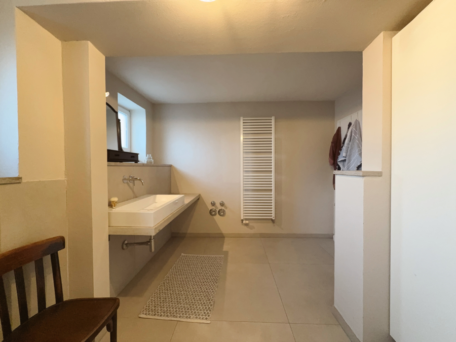 Über einen Flur mit einer dezent platzierten Nische für den Haushaltsbereich gelangen Sie in den privaten Rückzugsbereich der Wohnung. Hier empfängt Sie ein großzügiges, modernes Badezimmer, das mit einem edlen Steinwaschtisch aus Jura-Marmor, Dusche und Badewanne überzeugt. Die zurückhaltende Farbwelt unterstreicht den zeitlosen und zugleich luxuriösen Charakter dieses Raumes.